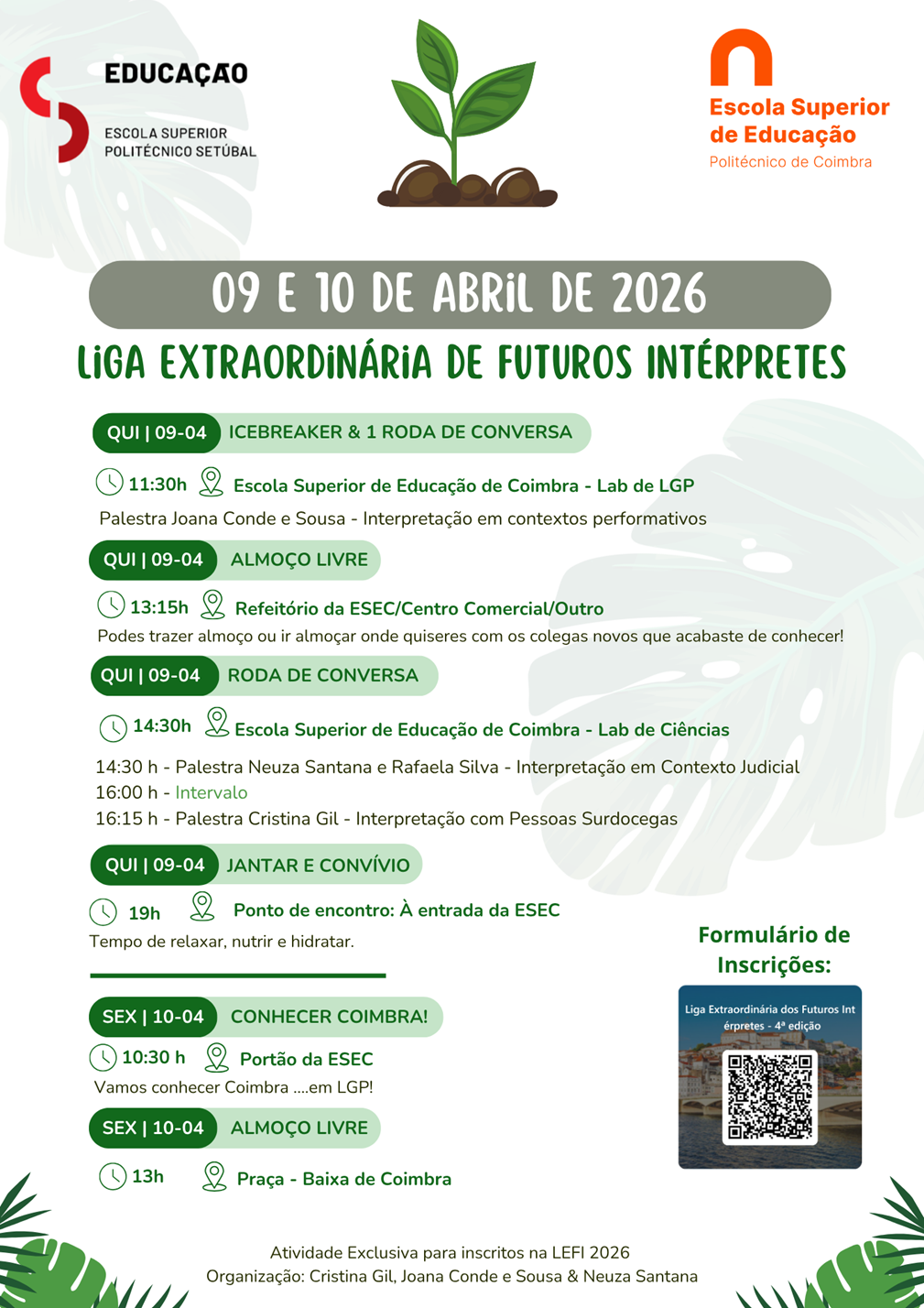 No âmbito de um projeto conjunto entre a Licenciatura de Língua Gestual Portuguesa (LGP) da Escola Superior de Educação de Coimbra e a Licenciatura de Tradução e Interpretação de Língua Gestual Portuguesa da Escola Superior de Educação do Instituto Politécnico de Setúbal, que iniciou em 2023, esta 4.ª edição contará com a presença dos estudantes da ESE de Setúbal que serão recebidos pelos nossos alunos da Licenciatura em LGP.