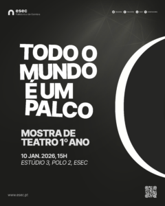 No dia 10 de janeiro de 2026 às 15h00, no estúdio 3 do Polo II da ESEC, serão apresentados os exercícios finais da disciplina de Interpretação I da licenciatura em Teatro e Educação da ESEC/IPC, coordenada pelo docente Ricardo Correia.