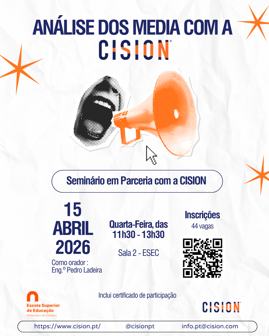 No próximo dia 15 de abril de 2026 (quarta-feira), entre as 11h30 e as 13h30, vai realizar-se na Sala 2 da ESEC um seminário sobre o tema “Análise dos Media – CISION”, que contará com a presença do orador Pedro Ladeira (Managing Director, Portugal & MED), em representação da CISION.